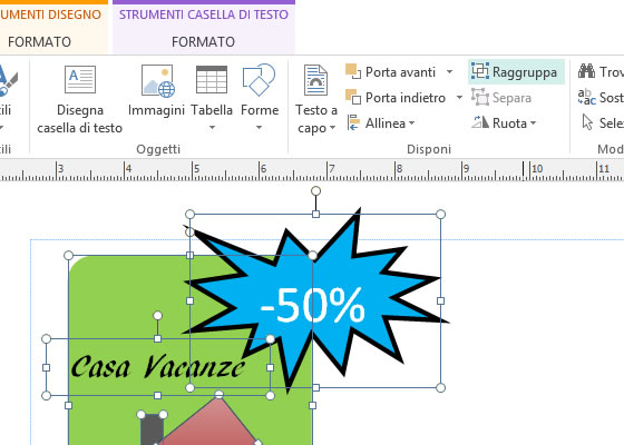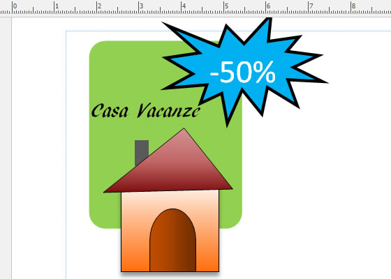 Abbiamo accennato in precedenza come posizionando correttamente gli oggetti, a partire dal fondo, non abbiamo necessità di utilizzare i comandi di posizionamento. Facciamo un esempio aiutandoci con la figura proposta. Per realizzare questo semplice slogan creiamo innanzitutto la forma di colore verde che occupa il primo livello (ovvero il fondo); successivamente possiamo inserire la stella ed aggiungere al suo interno del testo e la Casella di testo con la scritta “Casa Vacanze” (i due oggetti, non essendo tra loro sovrapposti, possono essere creati alternativamente); poi possiamo creare il camino (di forma rettangolare) che occupando la posizione dietro al tetto, assumerà la forma di un trapezio; successivamente creiamo il muro dell’abitazione, il tetto e la porta.