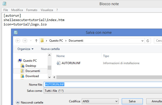 Il file, al quale assegneremo il nome autorun.inf, dovrà essere copiato nella root principale del DVD (nella stessa posizione dovrà essere copiata la cartella Web).