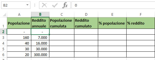 Nella colonna C della tabella (POPOLAZIONE CUMULATA) dovranno essere sommate, riga per riga, le persone che percepiscono i diversi scaglioni di reddito. Pertanto, nella cella C2 digiteremo uno 0 (zero) mentre nella cella C3 scriveremo la formula: